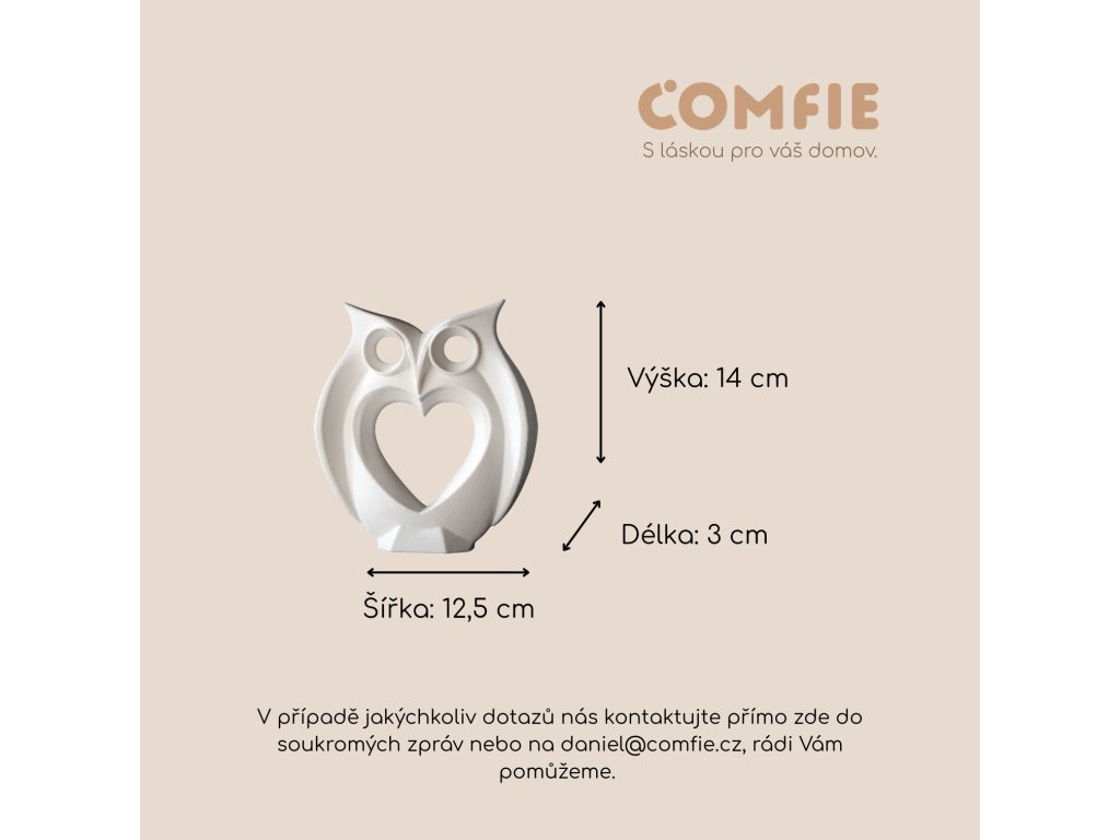 Sova je od pradávna symbolem moudrosti a věrnosti – v kombinaci se srdcem představuje hluboký a trvalý vztah. Díky svému elegantnímu a zároveň hravému vzhledu krásně zapadne do moderního i klasického interiéru, ať už ji umístíte na polici, komodu nebo noční stolek.