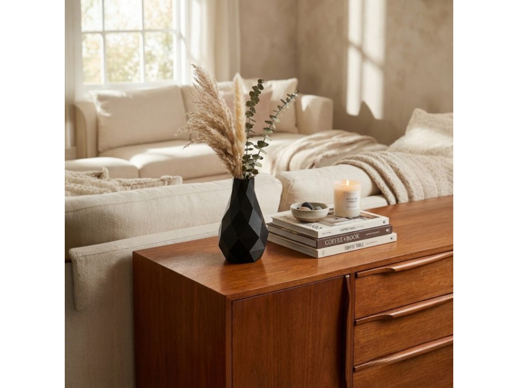 Elegantní geometrická váza v moderním stylu, která zvýrazní každý interiér. Dostupná v černé nebo bílé variantě. Ideální jako dárek ke kolaudaci nebo stylový doplněk do nového bydlení.