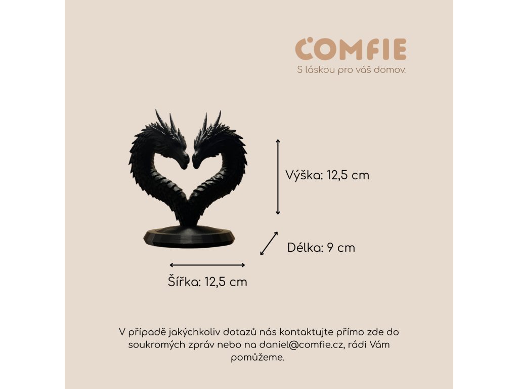 Rozměry dekorace jsou 12,5 cm (šířka) × 12,5 cm (výška) × 9 cm (délka). Díky kompaktní velikosti se krásně vyjímá na poličce, komodě, pracovním stole nebo nočním stolku. Dračí srdce je dekorace, která neztratí význam ani po Valentýnu.