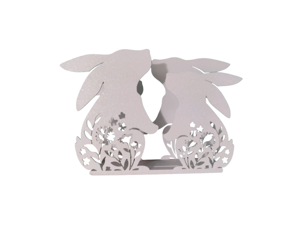 Roztomilý držák na ubrousky s motivem zajíčků je krásnou velikonoční dekorací, která dodá sváteční atmosféru každému stolu. Ideální doplněk pro jarní stolování.