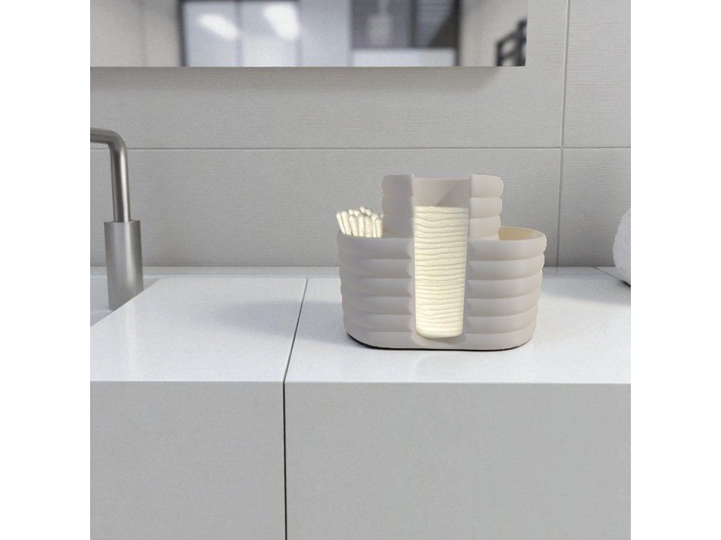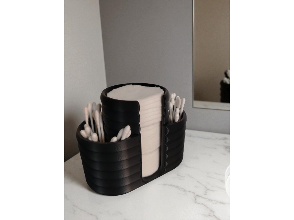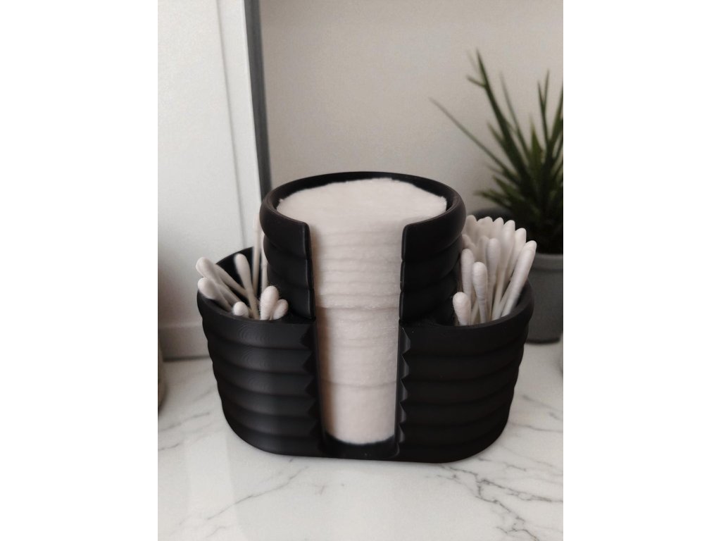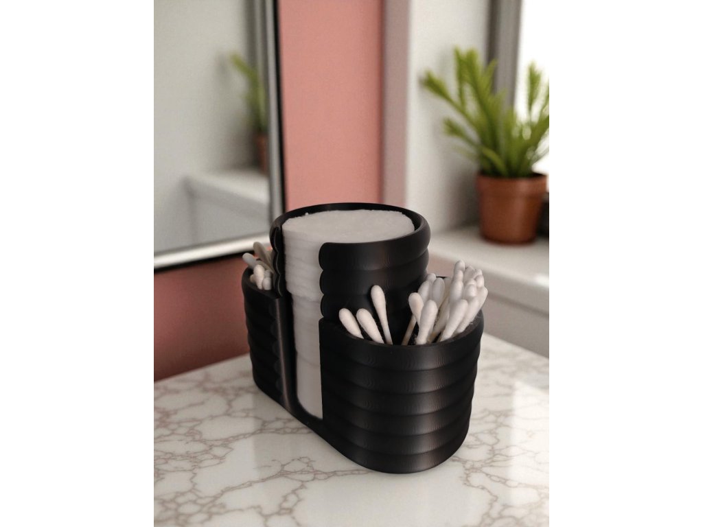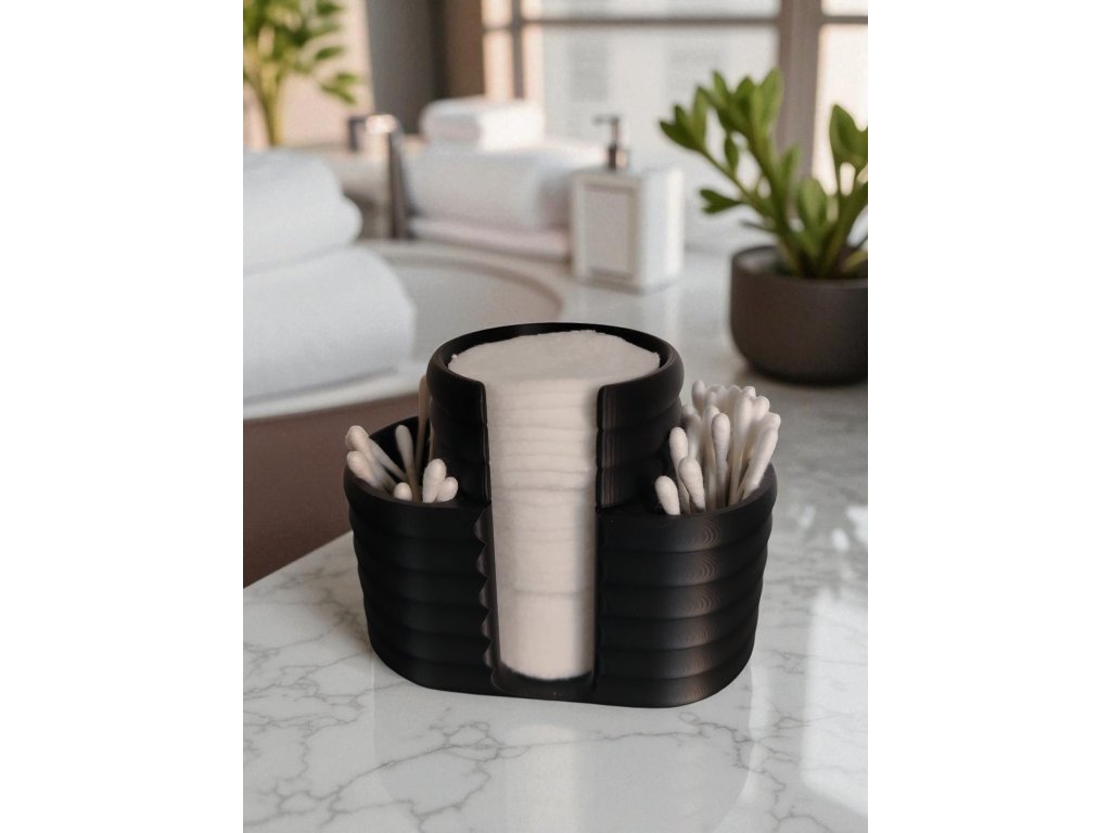 Tento designový držák na kosmetické vatové polštářky a uchošťoury je ideálním řešením pro ty, kteří chtějí mít svou koupelnu nejen organizovanou, ale i esteticky sladěnou.