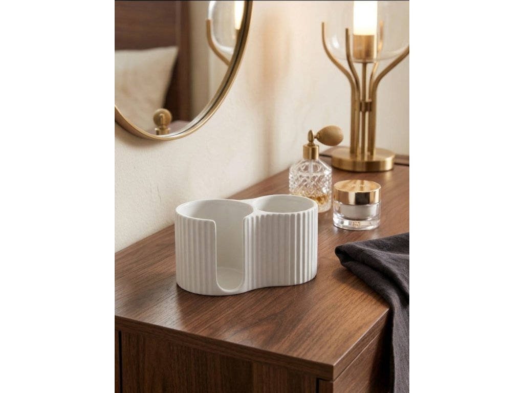 Organizér je ideální nejen do koupelny, ale také na kosmetický stolek, do ložnice nebo jako praktický doplněk pro líčení a péči o pleť. Jeho čisté linie a jemná textura vytvářejí elegantní dekorativní prvek, který zároveň pomáhá udržet pořádek.