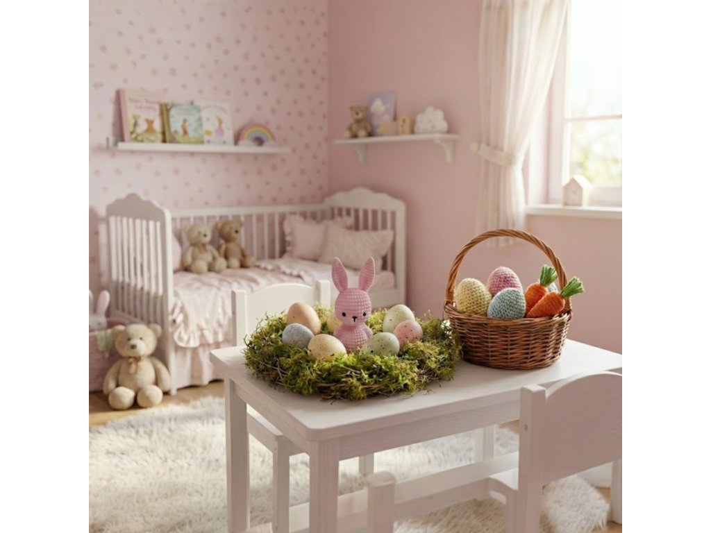 Roztomilý pletený zajíček v růžové, modré nebo bílé barvě, který zútulní váš domov a vnese jarní atmosféru do každého interiéru. Ideální velikonoční dekorace nebo milý dárek.