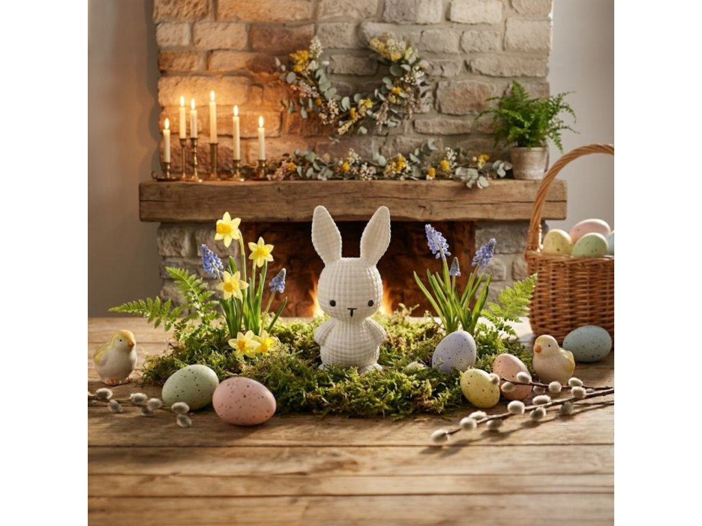 Zajíček je dostupný ve třech oblíbených barvách – růžové, modré a bílé – takže si snadno vyberete variantu, která nejlépe ladí s vaším interiérem. Skvěle se hodí jako dekorace na poličku, stůl, parapet nebo jako součást velikonočního aranžmá.