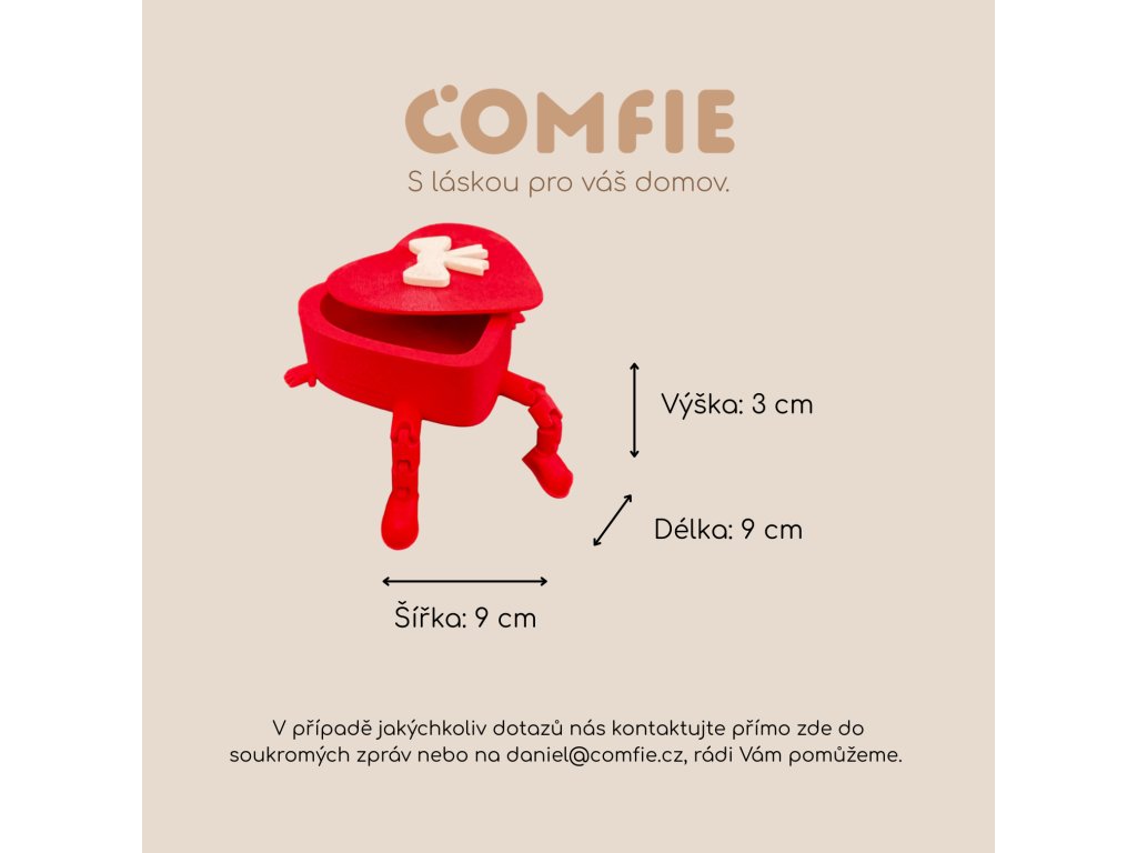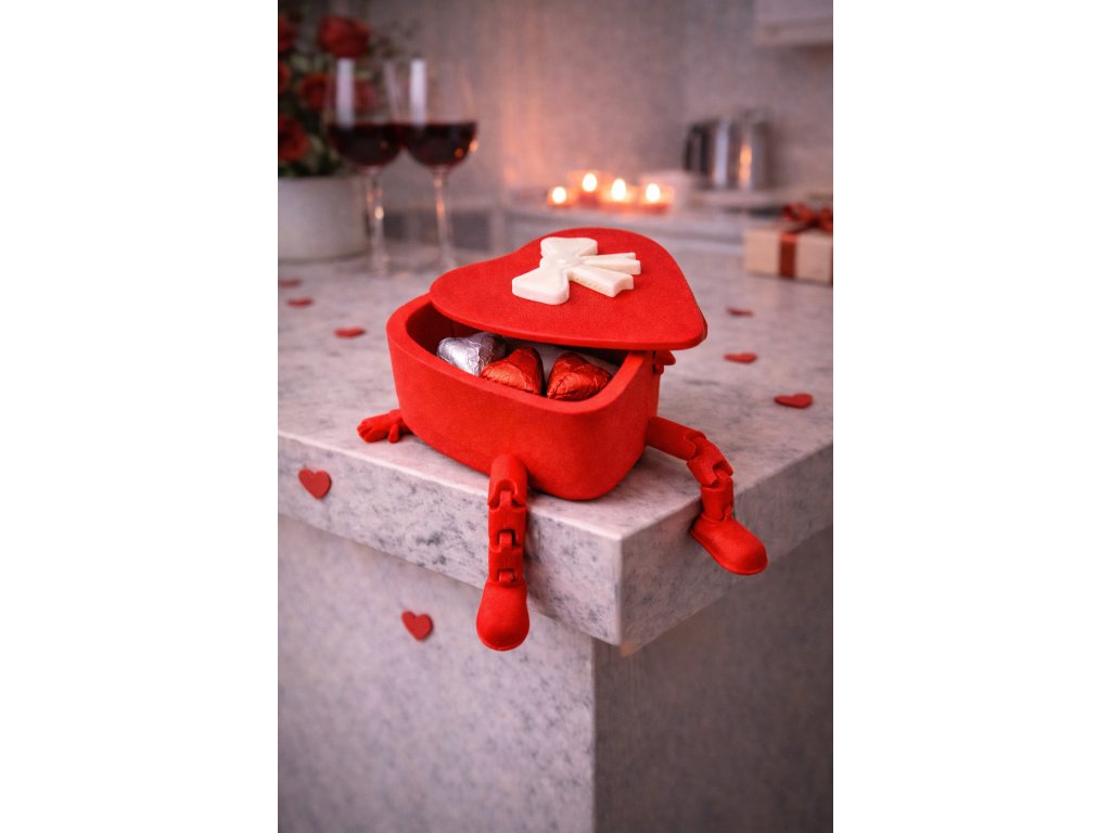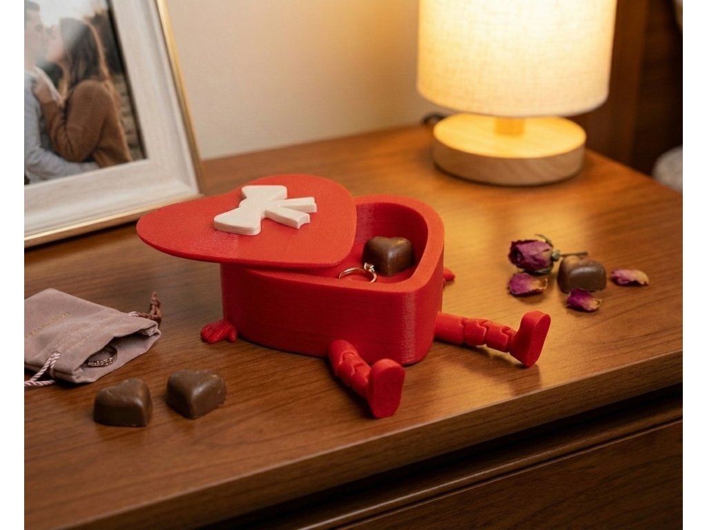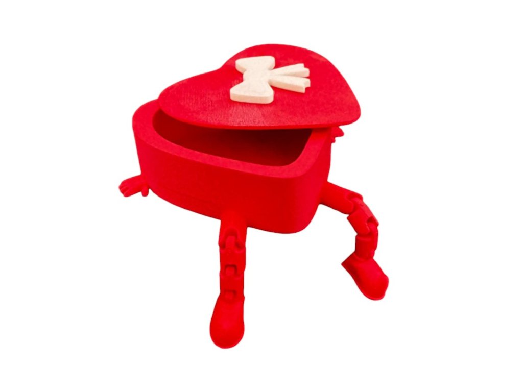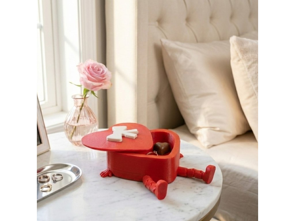Originální 3D tištěné srdce, které slouží jako dárková krabička i hračka. Má pohyblivé nožičky a víčko s roztomilou mašlí. Ideální obal na prstýnek, náušnice nebo sladké překvapení k Valentýnu či Dni matek.