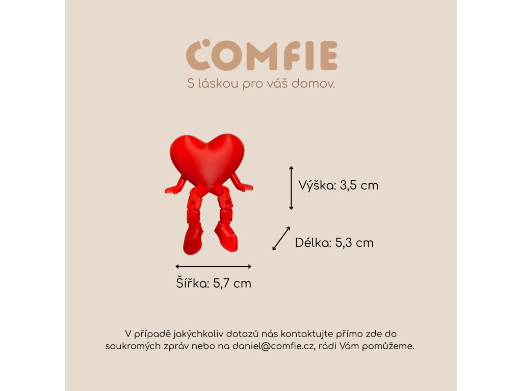 Tento kousek z dílny Comfie je tištěný z kvalitního materiálu a je navržen tak, aby zvládl každodenní manipulaci. Ať už ho darujete z lásky k Valentýnu, nebo jen pro radost kamarádovi, toto srdíčko bude věrně sedět a dělat radost tam, kam ho posadíte.