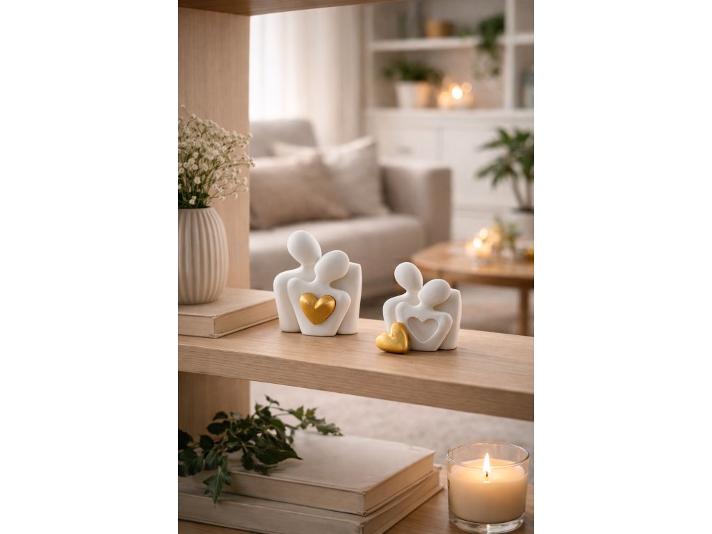 Tato minimalistická soška zamilovaného páru se zlatým srdcem jemně vyjadřuje hluboké pouto, lásku a blízkost dvou lidí. Čisté linie, bílá barva a kontrastní zlaté srdce vytváří elegantní dekoraci, která se hodí do moderního i klasického interiéru. Vyjímatelné srdíčko dodává sošce originální detail a osobní význam.