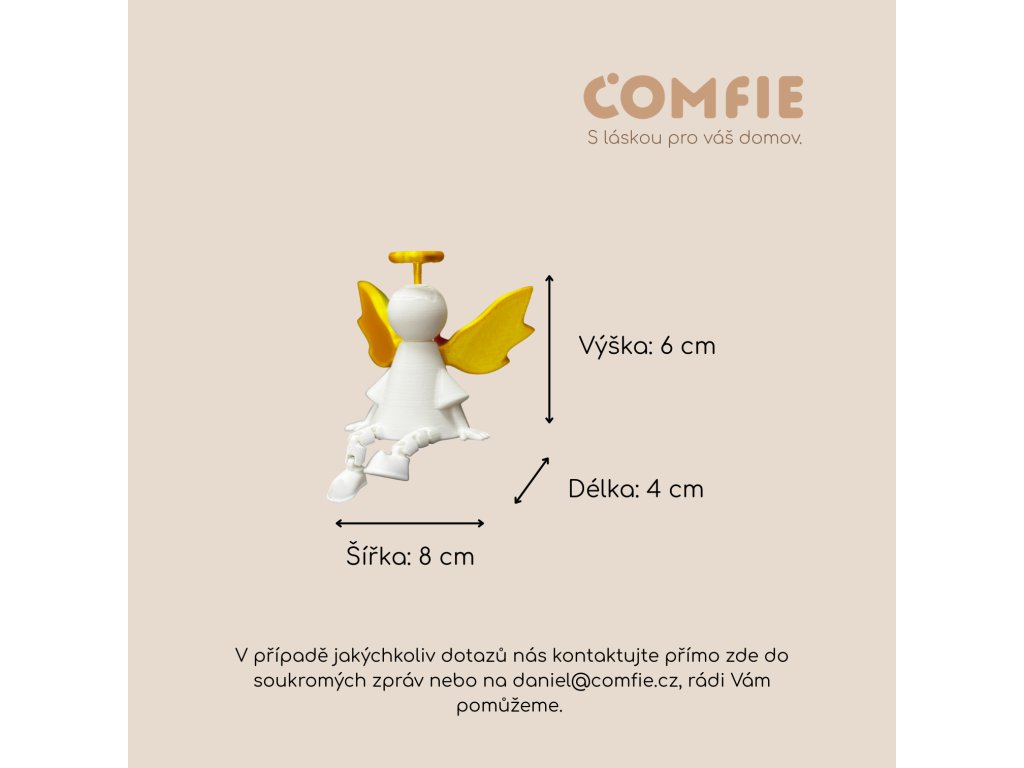 Tento andílek pochází od české značky Comfie a je 3D tištěný z ekologického PLA materiálu, který je šetrný k přírodě i vašemu domovu. Každý kus je precizně zpracovaný a díky pružným spojům se andílek dokáže přizpůsobit různým pozicím. Skvěle se hodí jako vánoční dekorace, doplněk do interiéru nebo originální dárek pro ty, kteří milují Vánoce a ručně vyráběné ozdoby.