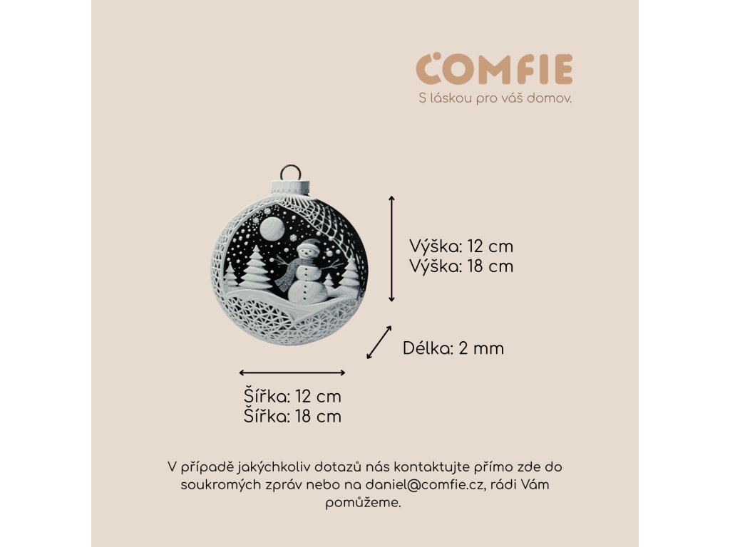 Ornament je plochý, s reliéfním 3D motivem na přední straně, a dostupný ve dvou velikostech – 12x12 cm a 18x18 cm. Nabízíme dvě barevné varianty: sněhuláka s červenou nebo černou šálou (na přání lze barvu upravit). Díky své nízké hmotnosti a preciznímu provedení se skvěle hodí k zavěšení na vánoční stromek, záclonu, dveře či věnec.