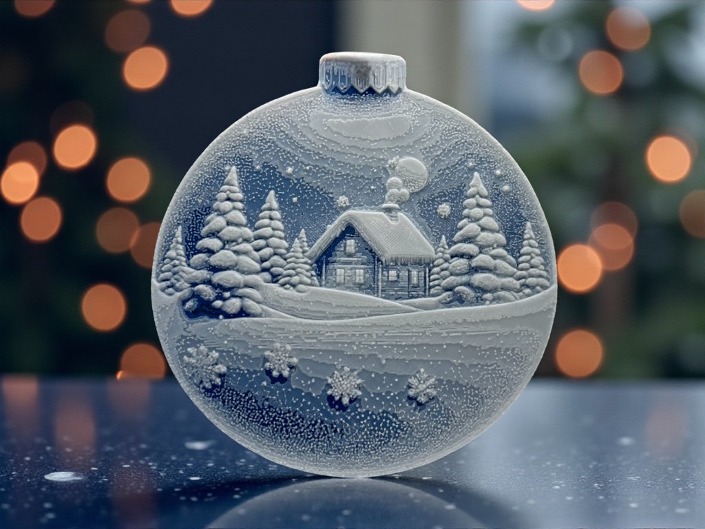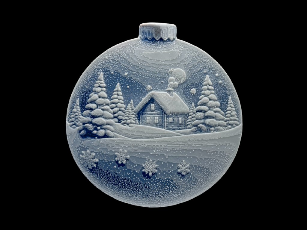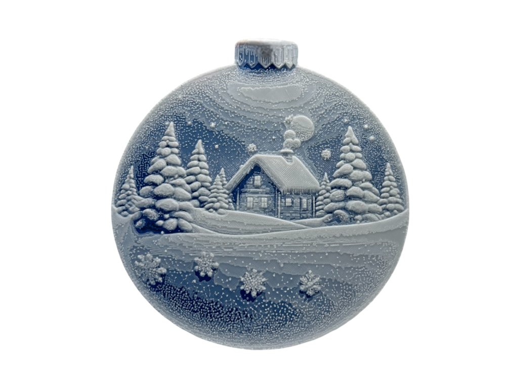 Vytvořte si doma tu pravou vánoční atmosféru s tímto nádherným vánočním ornamentem s motivem zimní krajiny. Detailní 3D tisk zachycuje zasněženou chaloupku obklopenou stromy a vločkami, které působí, jako by ožily v měkkém světle vánočních svíček.