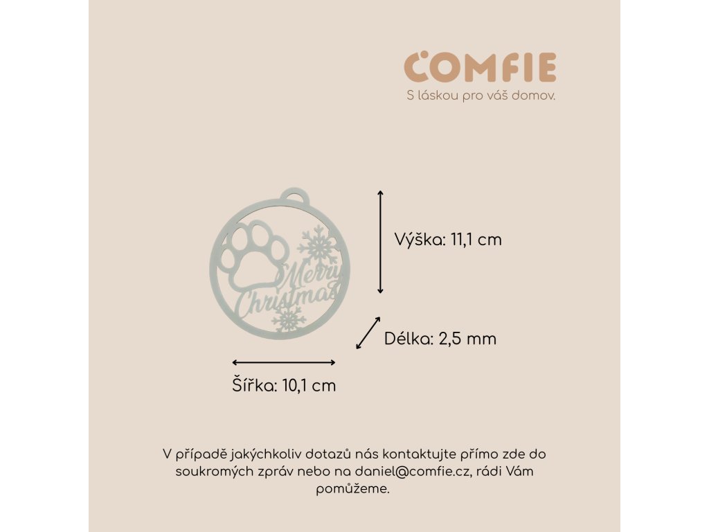 Dekorace pochází od české značky Comfie a je 3D tištěná z ekologického PLA materiálu, který je lehký, odolný a šetrný k životnímu prostředí. Každý detail – od nápisu Merry Christmas až po tvar psí tlapky – je precizně vytištěn s láskou a smyslem pro detail. Tento originální ornament je skvělým dárkem pro pejskaře, ale i stylovým doplňkem do každé domácnosti, kde jsou psi součástí rodiny.