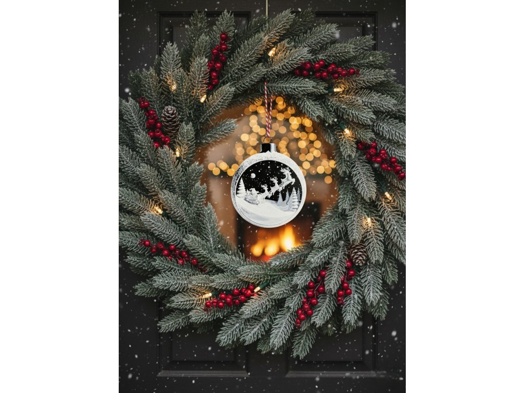 Dodejte svým Vánocům pohádkovou atmosféru s touto nádhernou vánoční ozdobou s motivem Santy jedoucího v saních se soby. Tento detailně zpracovaný ornament přináší kouzlo vánoční noci – zasněžené krajiny, hvězdné oblohy a létajících sobů.