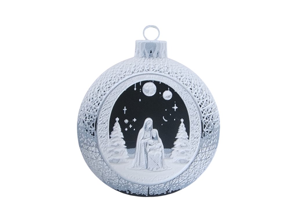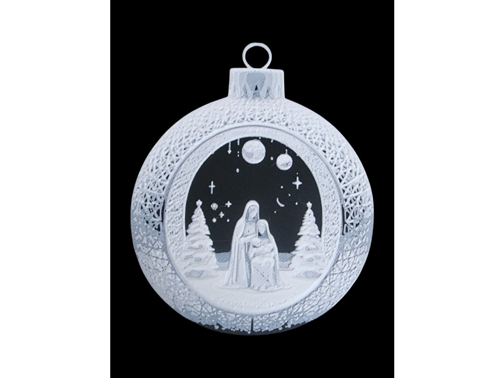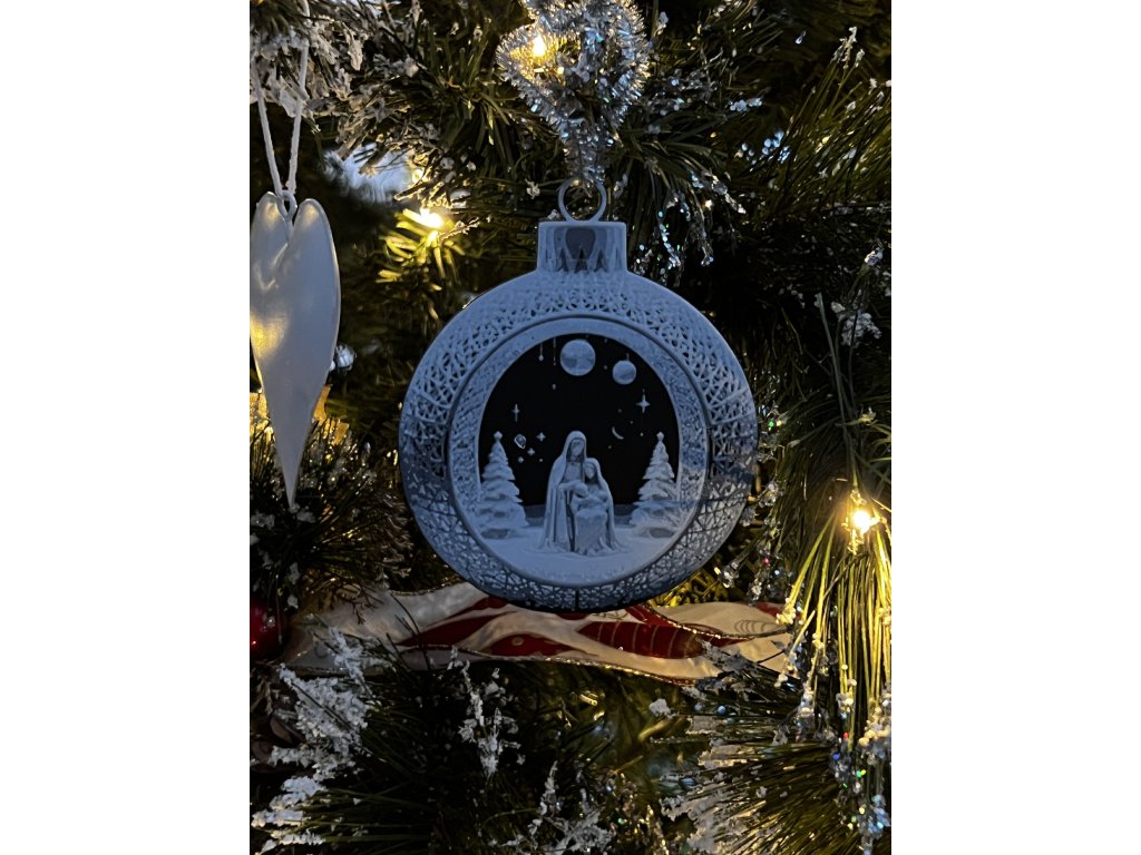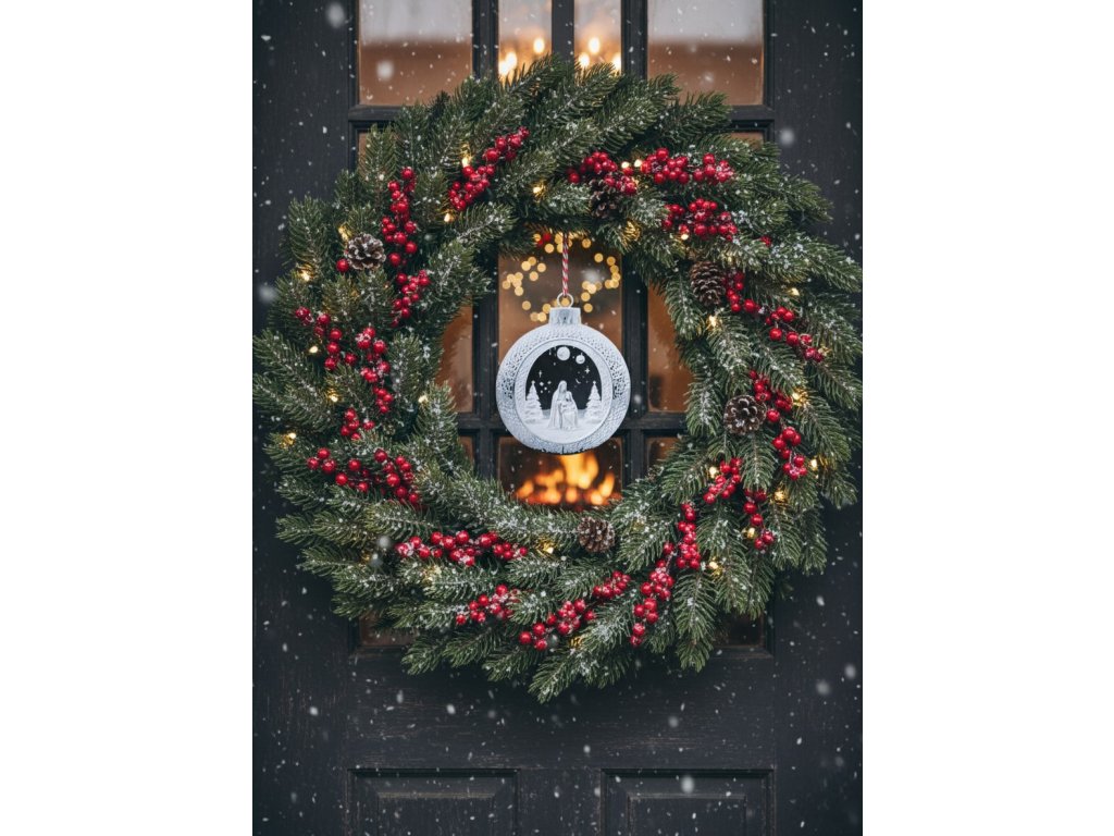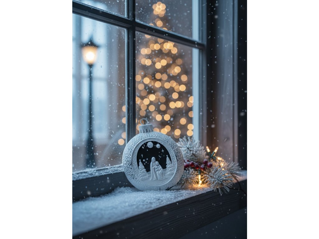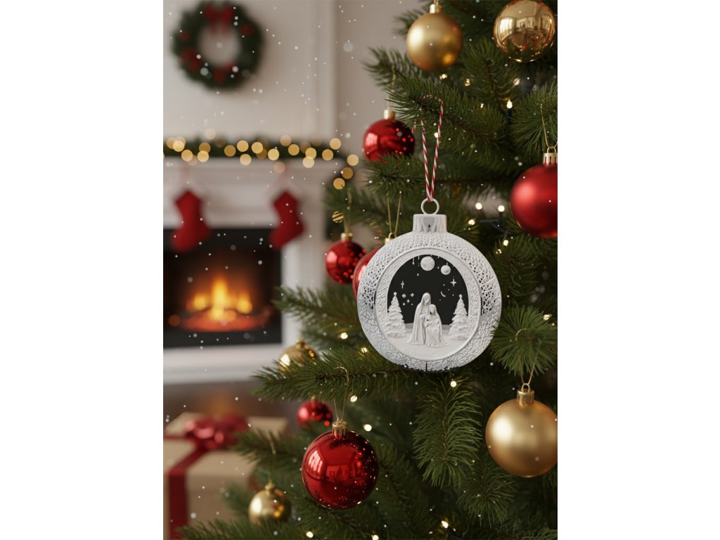 Vneste do svého domova kouzlo klidu a duchovní atmosféry s touto vánoční ozdobou se Svatou rodinou. Elegantní ornament zachycuje Marii, Josefa a malého Ježíška v zasněžené krajině pod noční oblohou plnou hvězd. Díky detailnímu 3D reliéfu působí velmi jemně a zároveň slavnostně – ideální pro vánoční stromeček, záclonu, sváteční stůl či zimní výzdobu.