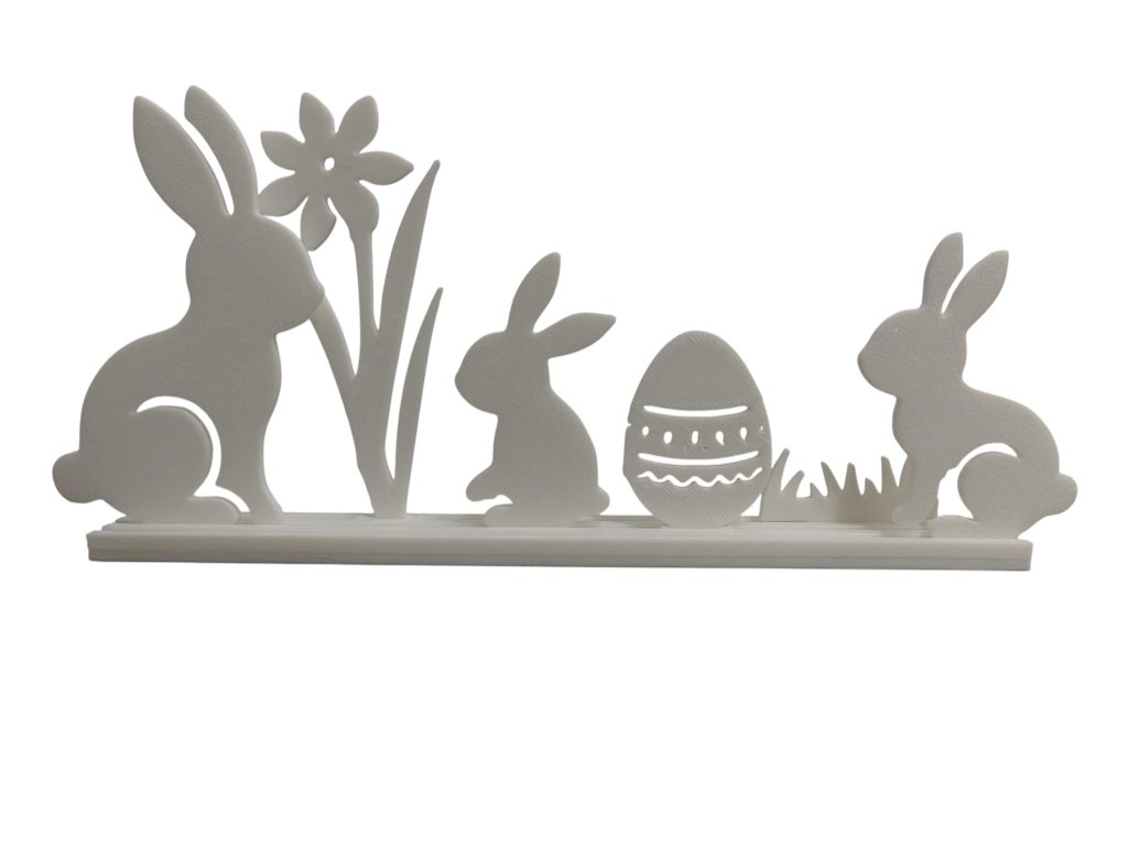 Vneste do svého domova jemnou jarní atmosféru s touto roztomilou dekorací rodinky králíčků. Elegantní siluety králíčků doplněné o velikonoční vajíčko a květinu vytváří harmonickou scénu, která působí moderně, klidně a přirozeně. Díky čistému designu se dekorace hodí jak do minimalistických, tak i klasických interiérů.