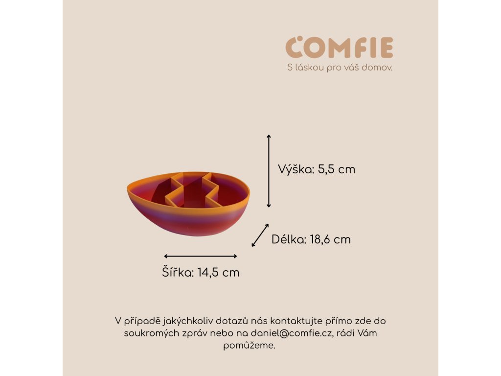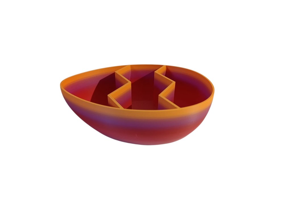 Miska je vyrobena pomocí 3D tisku z kvalitního PLA filamentu v barvě Sunrise Peach, který vytváří krásný barevný přechod v odstínech teplé broskvové, fialové a červené. Každý kus je originál – fáze barevného přechodu se může mírně lišit v závislosti na aktuálním navinutí filamentu, ale vždy obsahuje stejné barevné tóny, jaké vidíte na fotografiích.