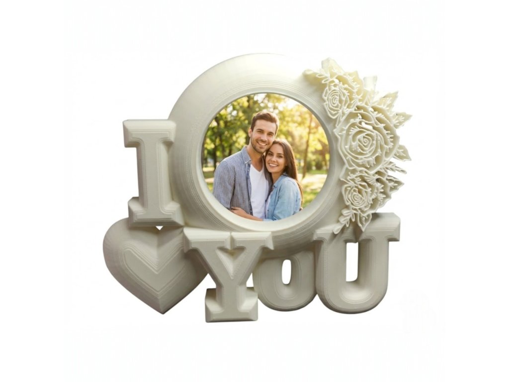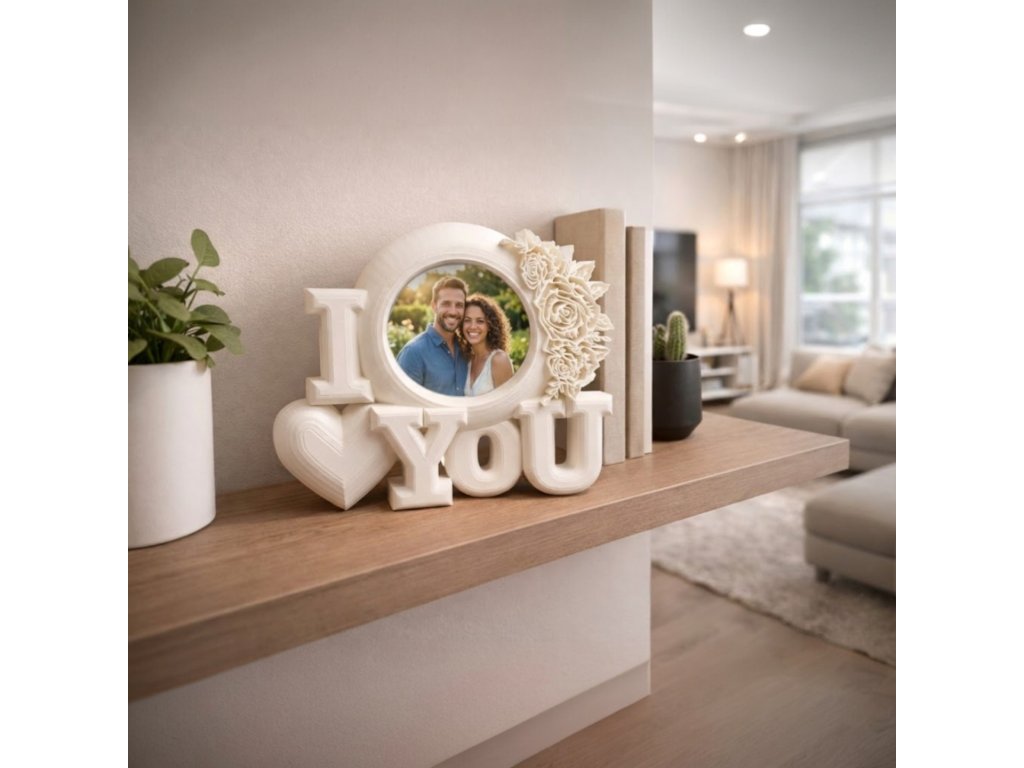 Romantický dekorativní fotorámeček s nápisem „I ❤️ You“ a květinovým zdobením. Ideální valentýnský dárek pro zamilované páry, který zachytí ty nejkrásnější společné vzpomínky.