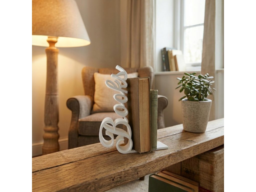 Stylová zarážka na knihy s nápisem BOOKS v moderním minimalistickém designu. Elegantní doplněk do obývacího pokoje, pracovny i knihovny. Dostupná v bílé a černé barvě.