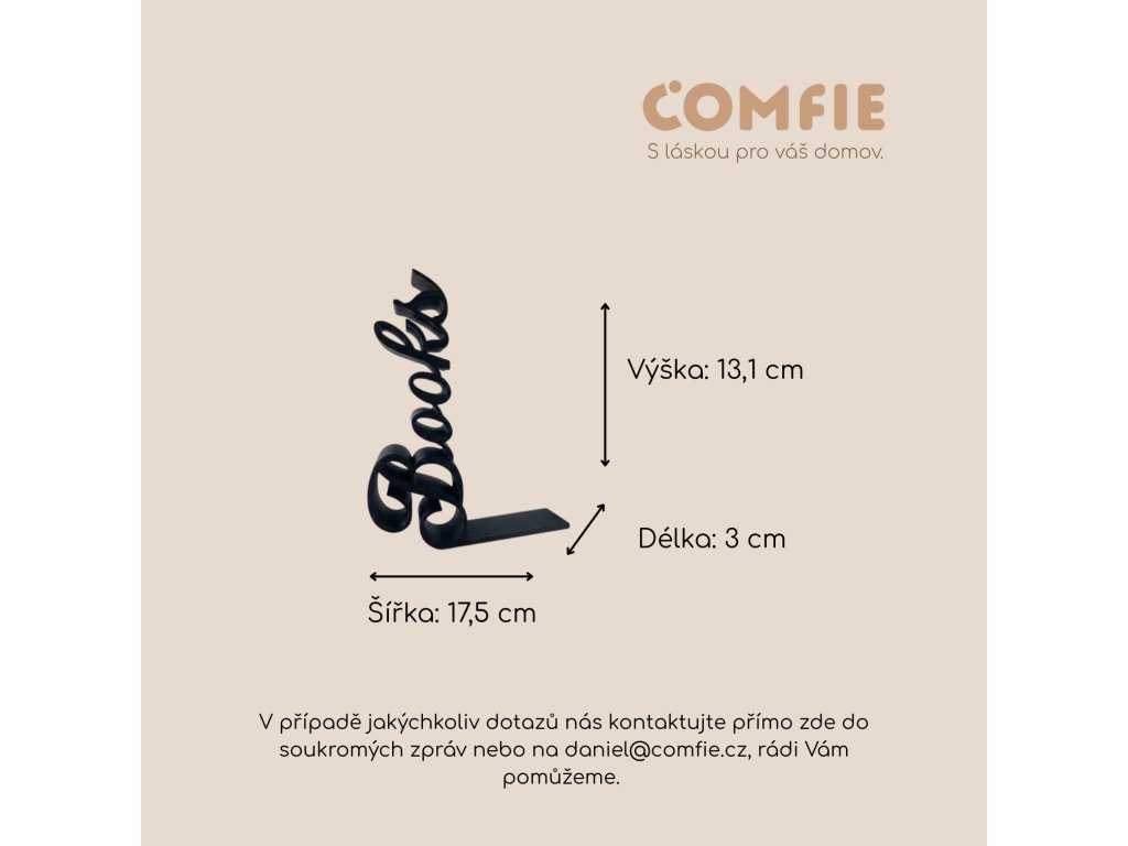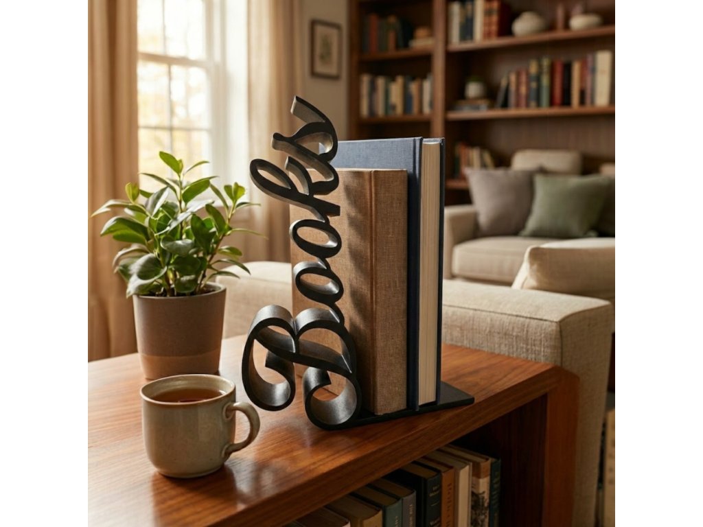 Dodejte své knihovně osobitý styl s designovou zarážkou na knihy BOOKS od značky Comfie. Tato moderní dekorace kombinuje praktičnost s estetikou a stane se výrazným prvkem každého interiéru. Minimalistický nápis v elegantním provedení krásně doplní knihovnu, polici i pracovní stůl.